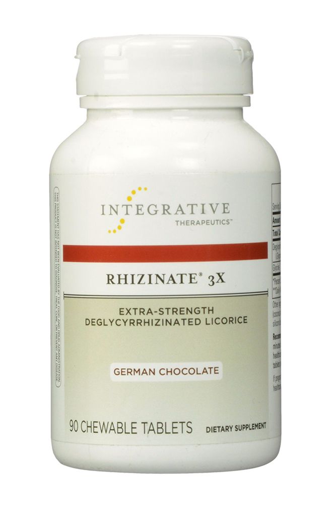 Rhizinate 3X is a highly potent form of DGL that includes glycine for additional intestinal repair, and which has had outstanding results for our patients over many years. It is three times stronger and better utilized by the digestive tract lining than its former version Rhizinate, and is the most effective DGL that we have experienced. It is formulated to mix efficiently with saliva which is necessary for its full effects and speeds its action. Its German chocolate flavor is delicious compared to the sometimes-unpalatable intensity of plain DGL. In blind taste tests, Rhizinate 3X was chosen nearly twice as often as comparably-concentrated brands, which is important for a remedy that needs to be taken two or three times daily for weeks or longer. Glycine adds to the effectiveness of DGL: it is a stable amino acid that boosts the resilience of the stomach lining against acid and can aid repair of the intestinal mucosa. It also brings further stomach protection as it is a precursor for glutathione, one of the body's natural antioxidants that can protect stomach and intestinal lining cells from oxidative damage. We have seen excellent outcomes with Rhizinate 3X for easing the pain of non-ulcer dyspepsia, gastro-esophageal reflux or GERD, for healing canker sores, and in several cases for reversing Barrett's esophagus on biopsy, a condition in which abnormal cells develop that increase the risk of esophageal cancer. To repair the intestinal lining we generally recommend that patients take it two or three times daily for four to six weeks. Then for prevention or minor flare-ups of symptoms they use it for a week or two.