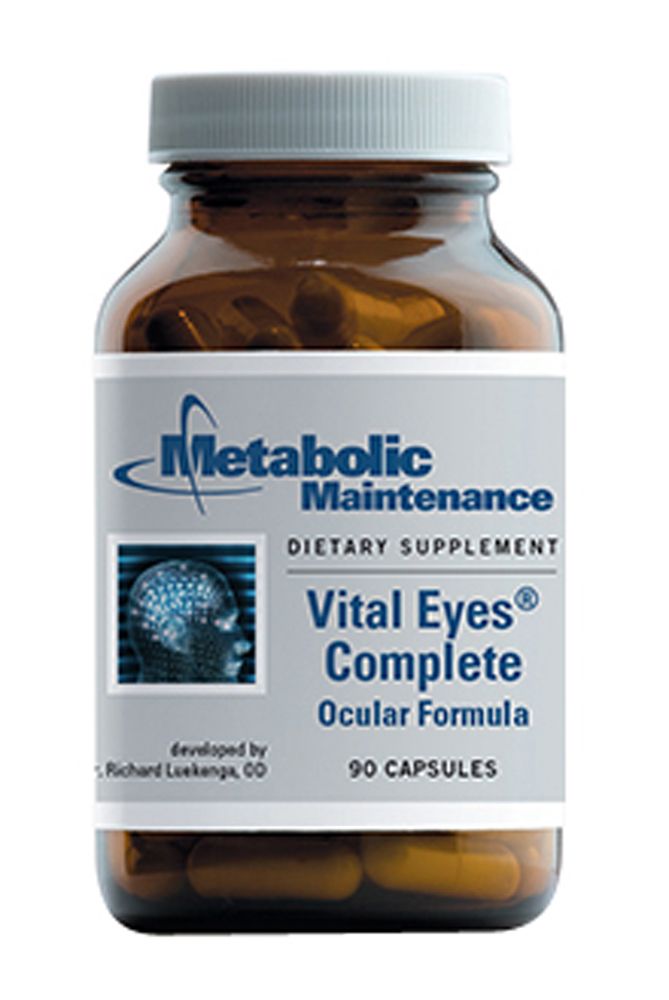 Vital Eyes Complete contains virtually every well-researched eye nutrient to protect the retina and also the lens in high doses, and it also doubles as a fine multivitamin and mineral formula. This formula features an excellent dose of 18,000 IU of mixed natural carotenes, including alpha and beta-carotenes as they exist in Nature, with 20mg. of lutein and 10mg. of zeaxanthin. Natural carotenes are proven to be more effective for preventing macular degeneration and improving macular pigment density and visual acuity than isolated beta-carotene. The famous AREDS trial used only beta-carotene, which was less effective and actually displaces lutein consumed in the diet. Vital Eyes Complete includes a high dose of 60mg. of zinc, balanced with the correct amount of copper to protect blood cells; found in long-term trials to reduce macular degeneration development by 25% over six years. It has taurine, vitamin C, and CoEnzyme Q10 which are classic lens protectors to slow cataract progression. Lipoic acid is an antioxidant specifically for the nervous system including the retina which originates in the embryo from brain tissue. Vitamin E and selenium add further antioxidant protection, and vitamin D3 is a known brain and nerve cell nutrient. The bilberry in Vital Eyes Complete is standardized to 25% anthocyanosides and generously protects both the retina and lens against oxidative damage to reduce the risk of macular degeneration and also cataract. We have numerous patients who have been delighted to have stable or improved eye exams over years on this formula after a diagnosis of macular degeneration or cataract, or who have a family history or high risk of eye disorders and take it for long-term protection.